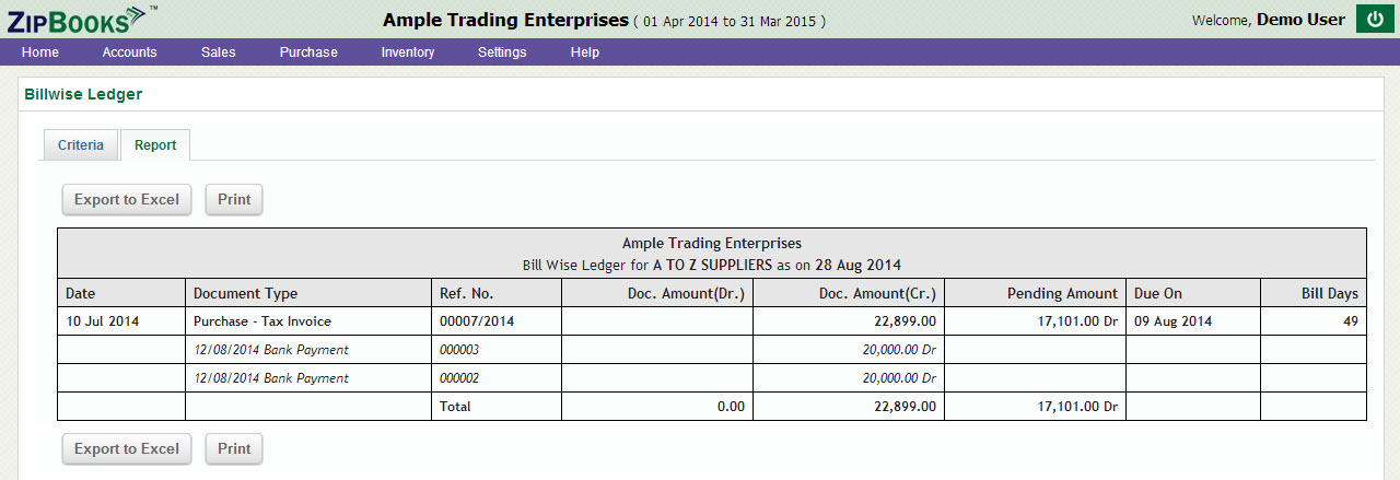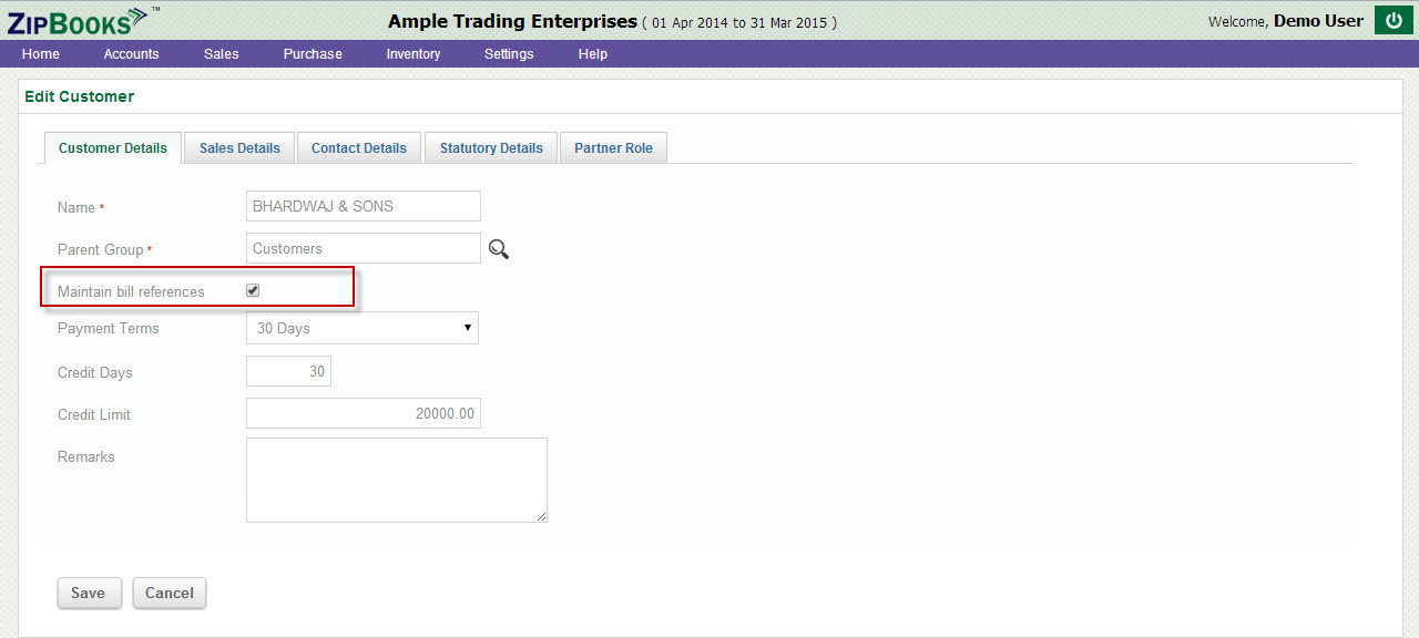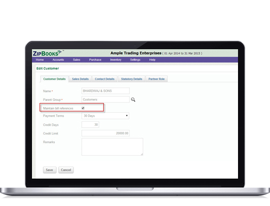 ZipBooks allows you to maintain Bill References wherein you can record the details of payment terms of your customers and vendors. You can also enter their credit days and the credit limit. This gives you full details of your bills and helps you decide which bills will be received and which you will have to pay and when. You also get an idea about the credit limit you have allowed to your customers and that which have been allowed by your vendors making it possible to maintain your accounts efficiently.
