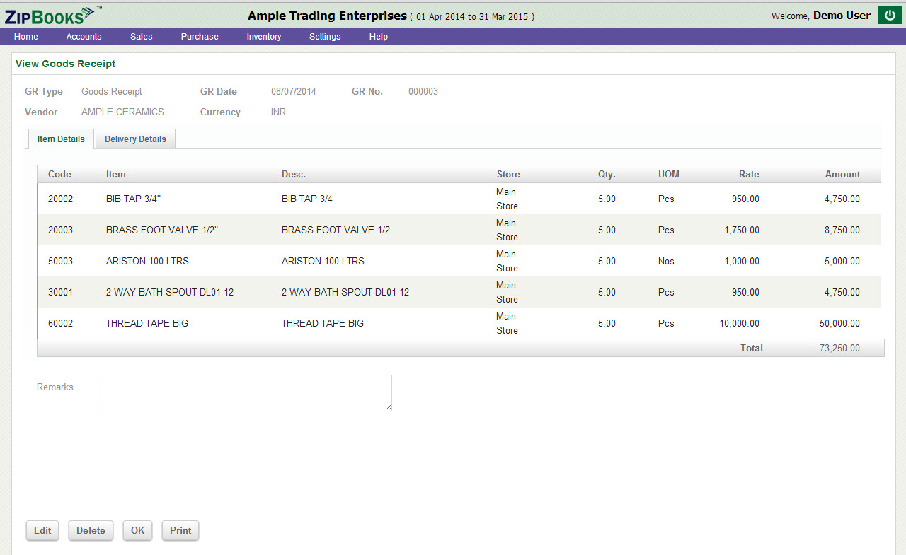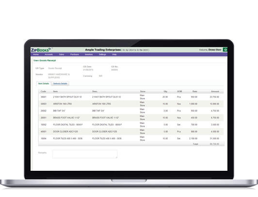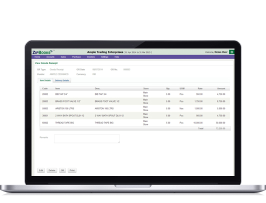 ZipBooks enables posting of Goods Receipt with respect to stock arrived at your location. It allows to record Goods Receipt with as well as without reference to purchase order. You also get the delivery as well as the store details along with unit of measurement. This makes your inventory management system better, with delivery and receiving errors being reduced. There is an improved reconciliation between order, goods receipt and invoices, which makes payments faster. It also ensures greater data accuracy.