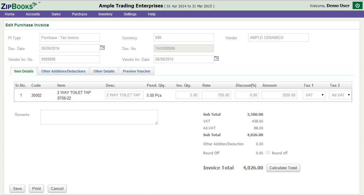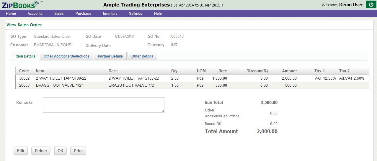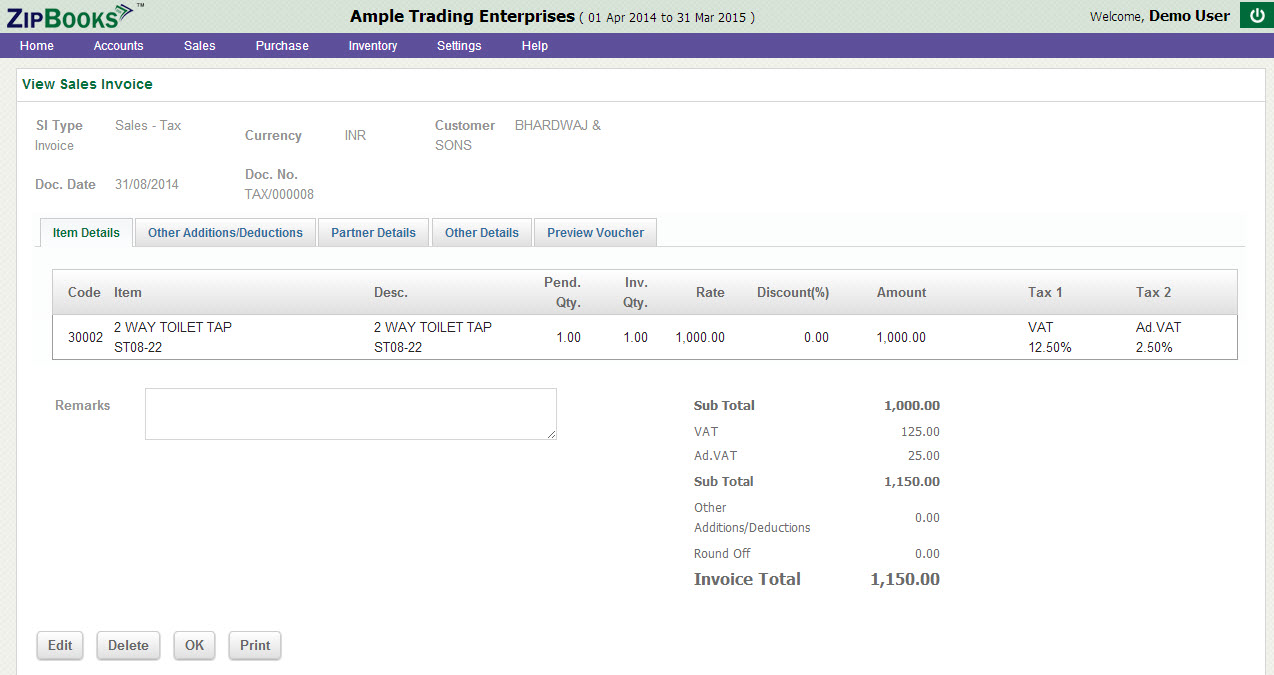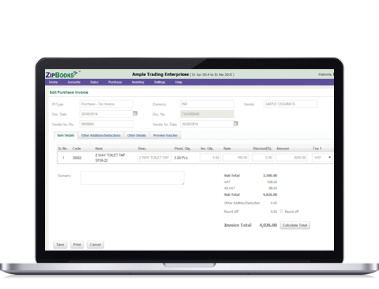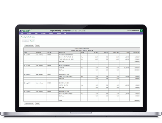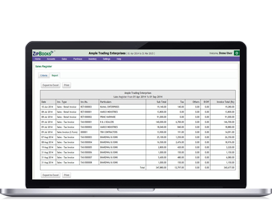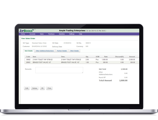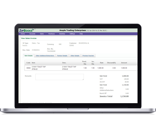 Sales Invoice in ZipBooks results in considerable savings and better control. It frees you from manual handling, helping you to automate and streamline your invoice flow. Chances of errors and duplication gets reduced, which raises the data quality. Through ZipBooks you can even post Sales Invoice with reference to Sales Delivery thus helping you to maintain your organization's sales flow. Sales Invoice prepared through ZipBooks thus results in shorter processing time and better control of delivered goods.