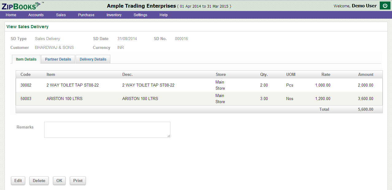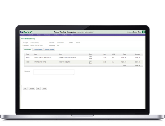 Sales Delivery in ZipBooks can be posted with or without reference to Sales Order. It captures the details of items to be delivered along with the customer details and delivery details. Through Sales Delivery you can meet the customer requirements in time and give commitment to the customers about the correct delivery dates with quantity thus streamlining the entire sales process.
