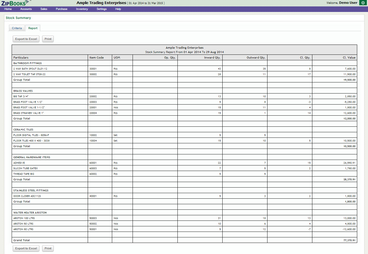 ZipBooks offers a wide variety of means to view and examine your inventory through its reports. It has strong search and filtering facility. These reports can even be exported to Excel. The inventory reports in ZipBooks tracks prices, profitability and all inventory transactions along with current status as well as the count of items in inventory. Below is the list of Inventory Reports generated in ZipBooks: